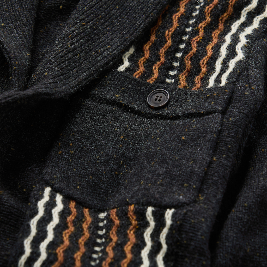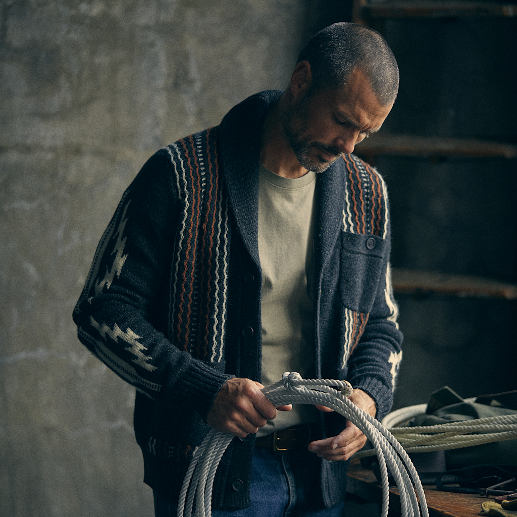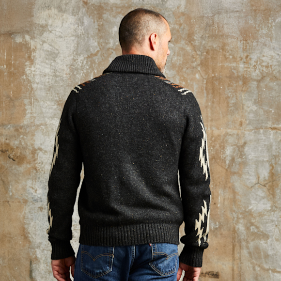 Drawing from early 20th-century saddle blankets and 1930s Western jackets, this cardigan has a rich, distinctive heritage. The textured jacquard panels and Donegal-flecked yarn bring depth and character that give this one-of-a-kind piece a timeless appeal.