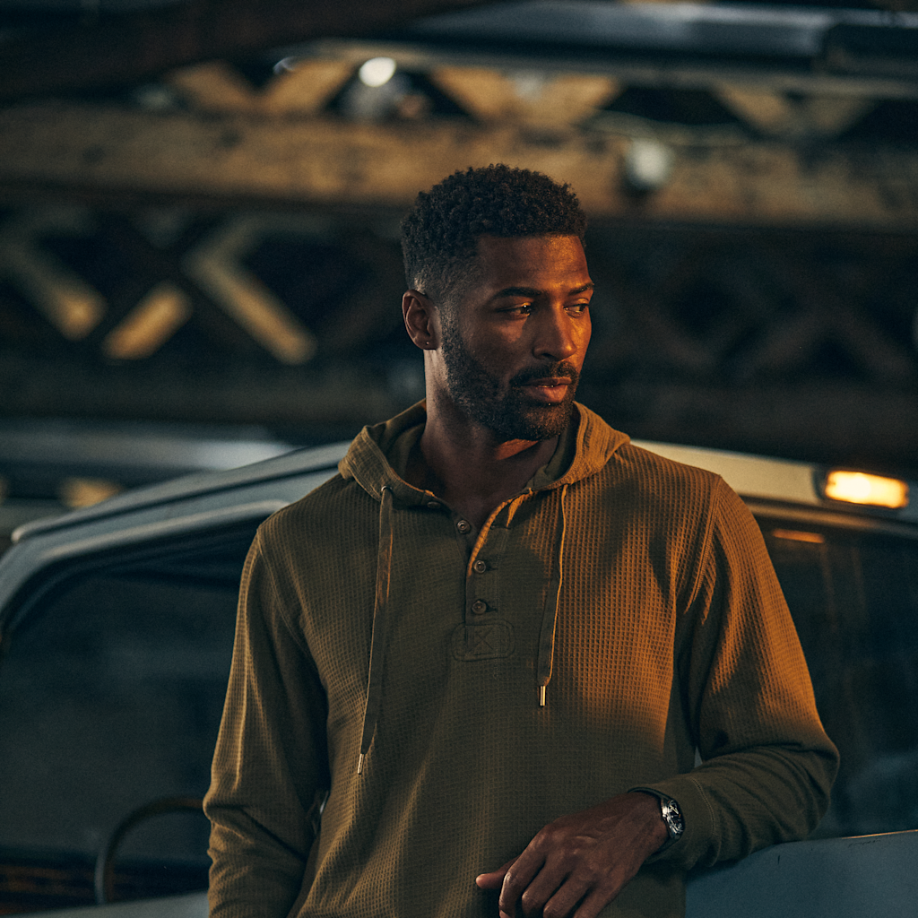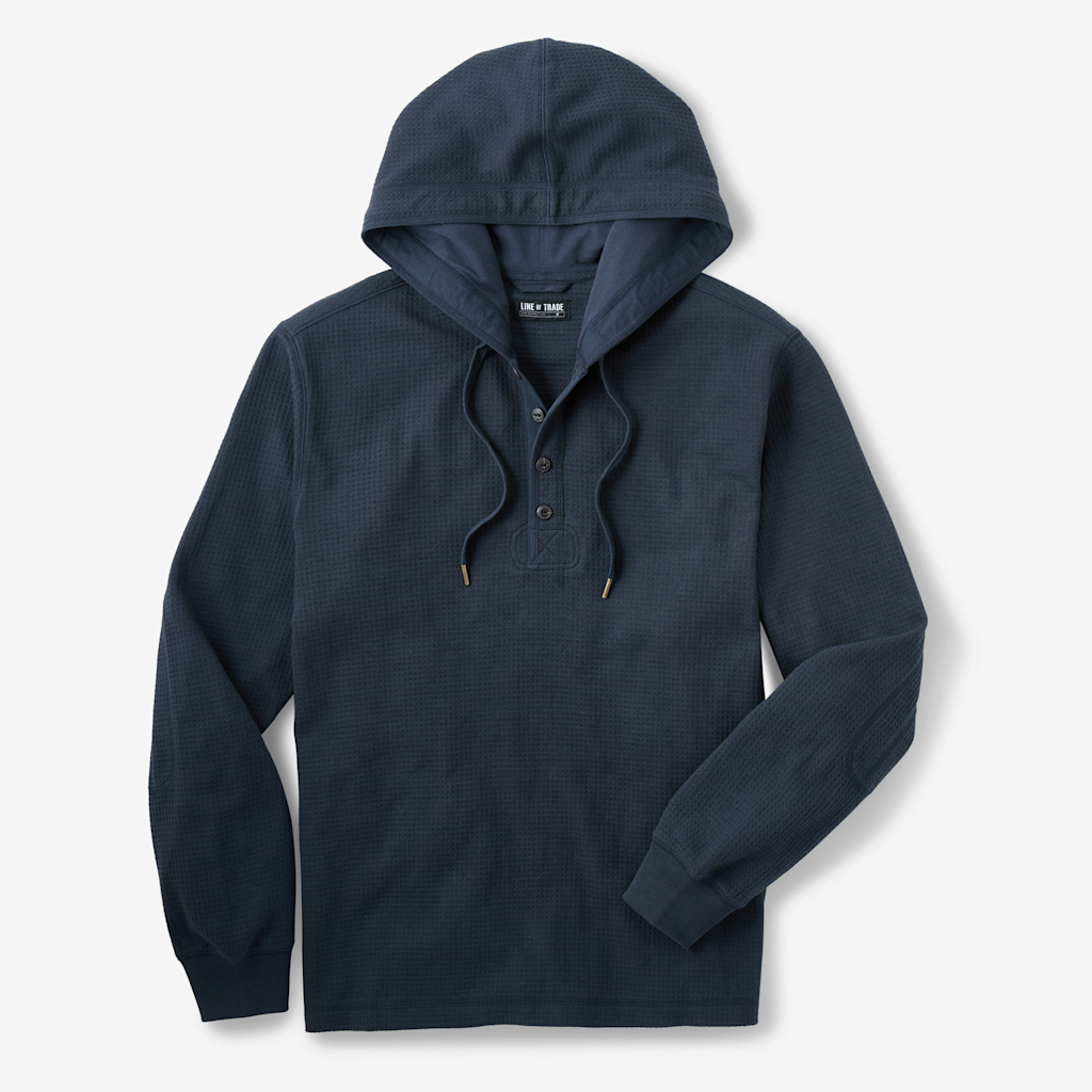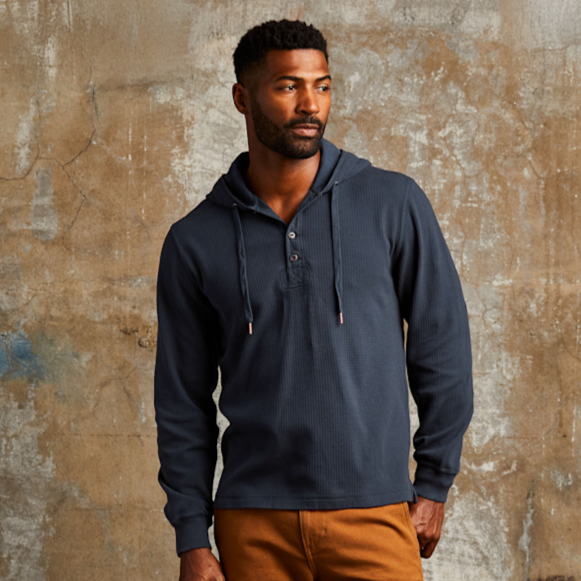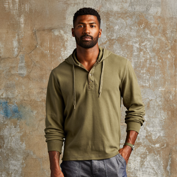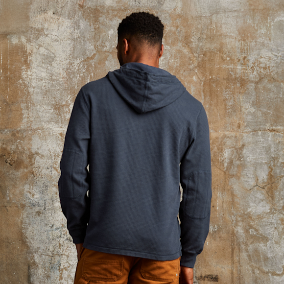 With a square-knit waffle texture that traps warmth, rugged twill details, and a cotton jersey-lined hood, the Waffle Thermal Hoodie takes inspiration from military base layers and elevates it for daily wear. It’s soft, structured, and detailed all the way down to the elbow patches and herringbone trim. Pull it on under a jacket or wear it solo — it’s got the kind of texture and construction that works year-round.