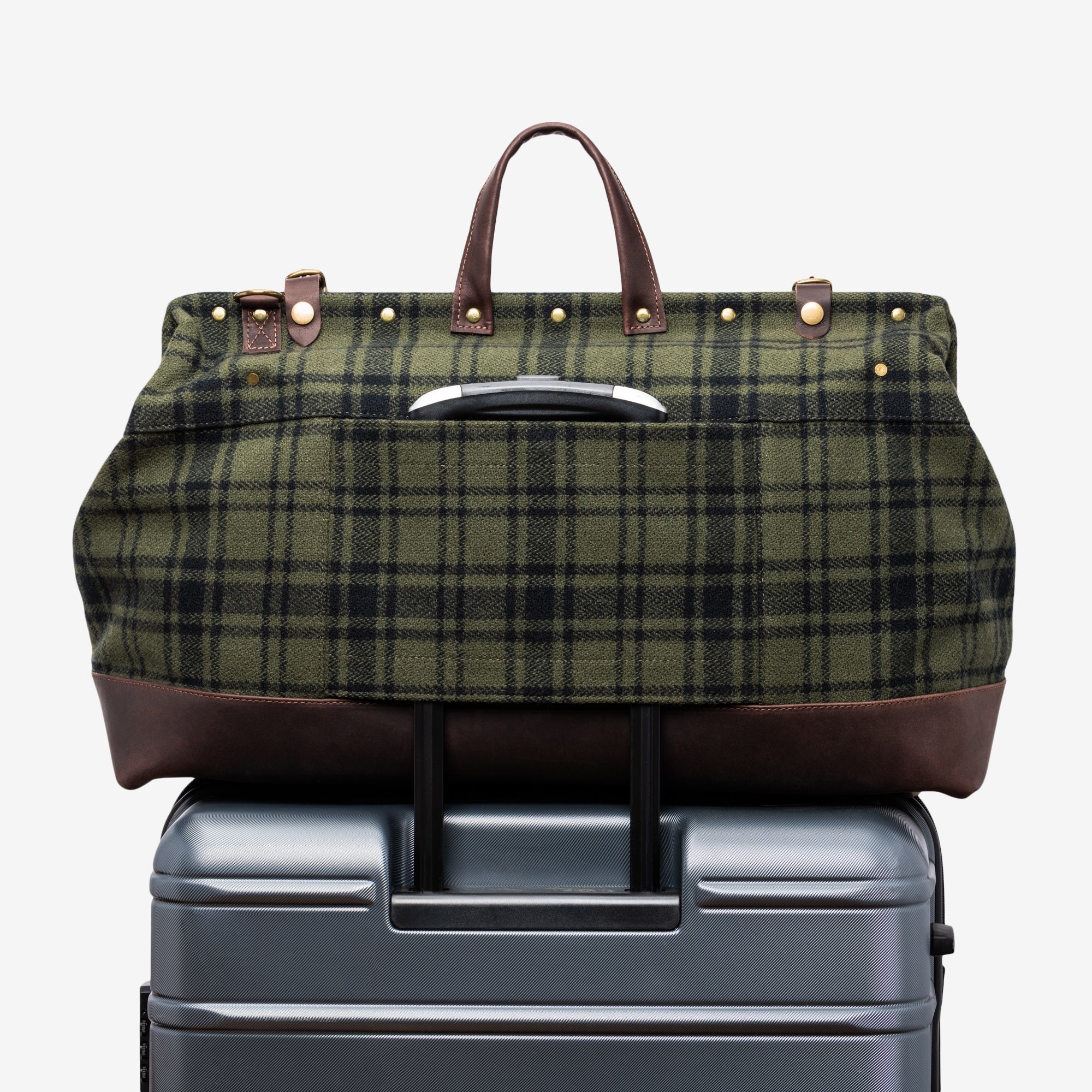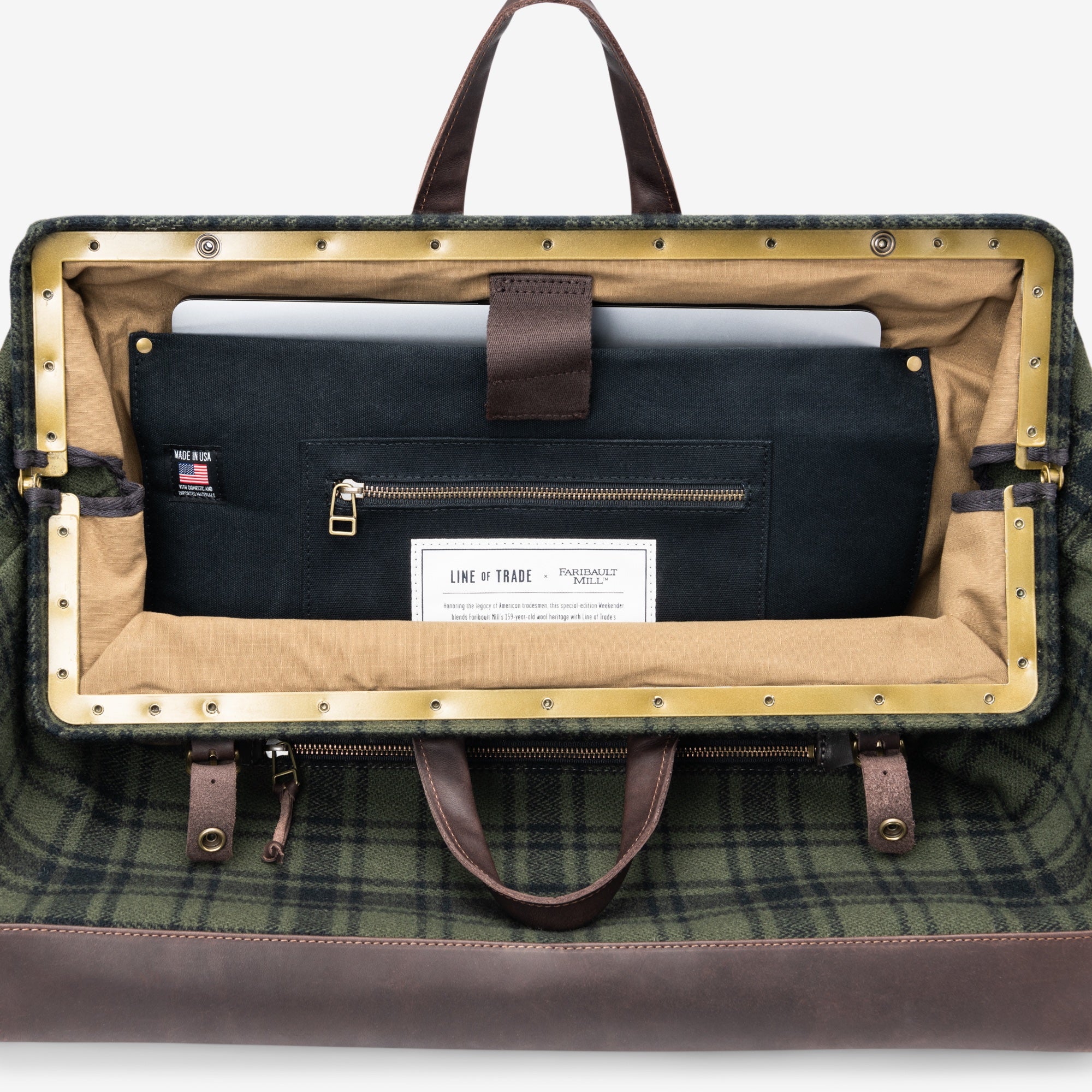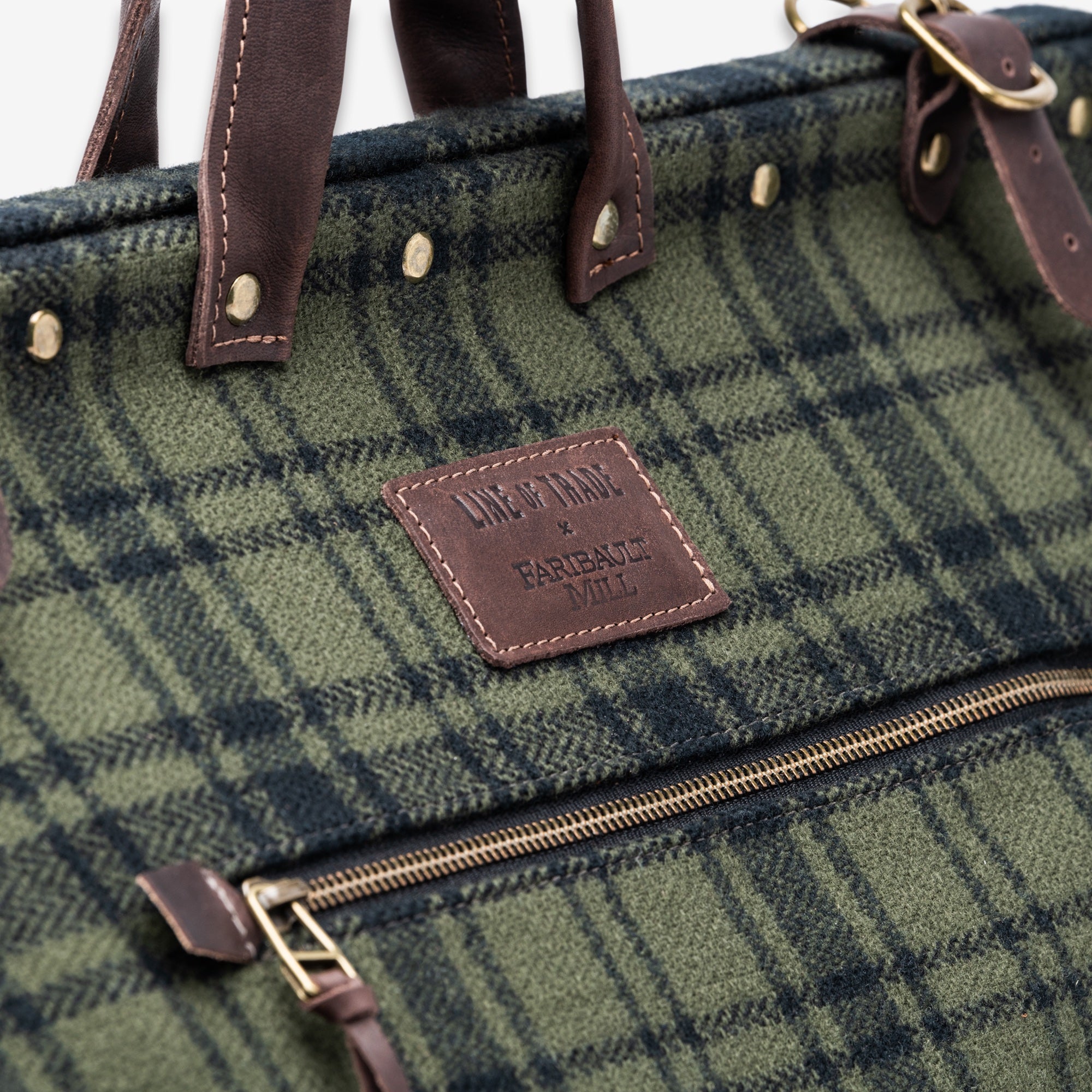 This special edition of the Weekender Bag outfits the bestseller in a custom plaid designed by the Line of Trade team and made along the Cannon River in Minnesota at Faribault Mill, a 157-year-old historic vertical wool mill and one of the last of its kind in America. True to its stonemason origins, it’s built with a roomy interior for plenty of storage space, an interior pocket for a laptop, a zippered security pocket, and a sturdy metal frame that stays open and upright for easy packing. Ready for secure transport, this travel duffel bag features handsome leather handles and buckles made by a Minnesota tannery, a removable crossbody shoulder strap, and a back trolley loop to slide onto luggage handles.