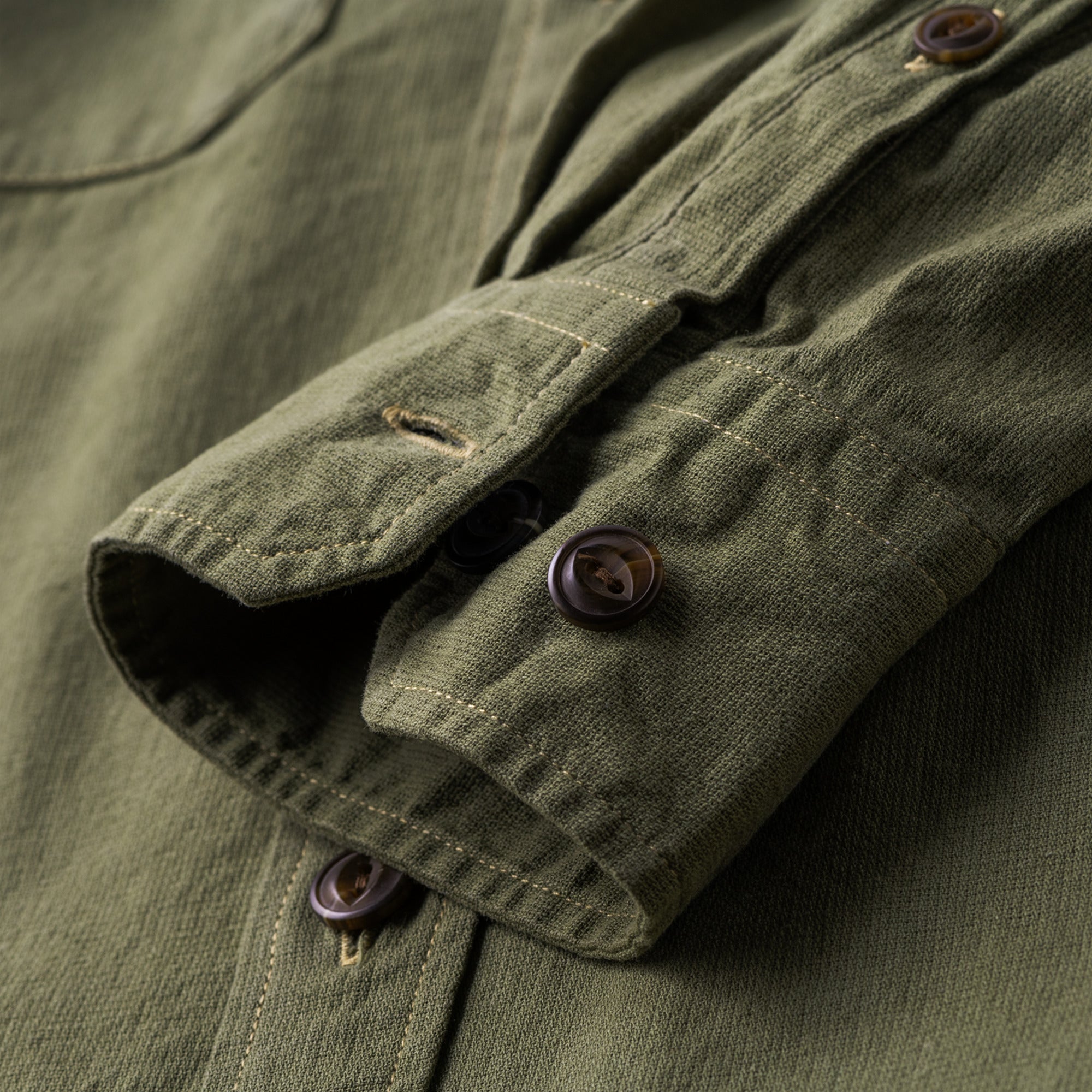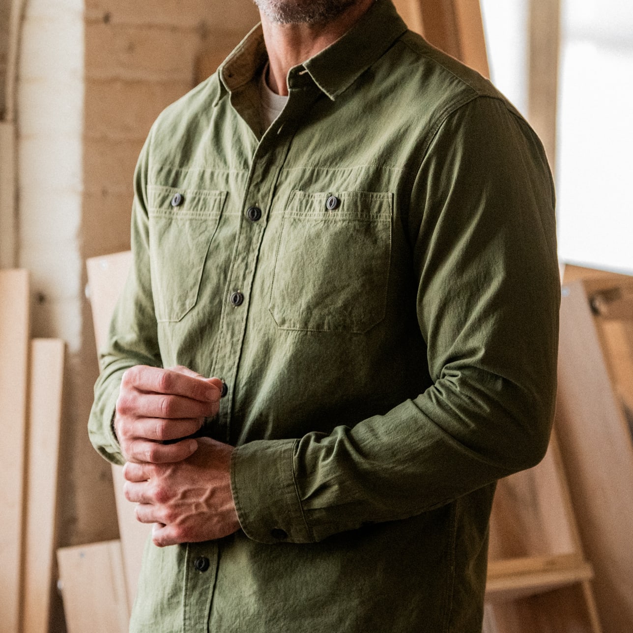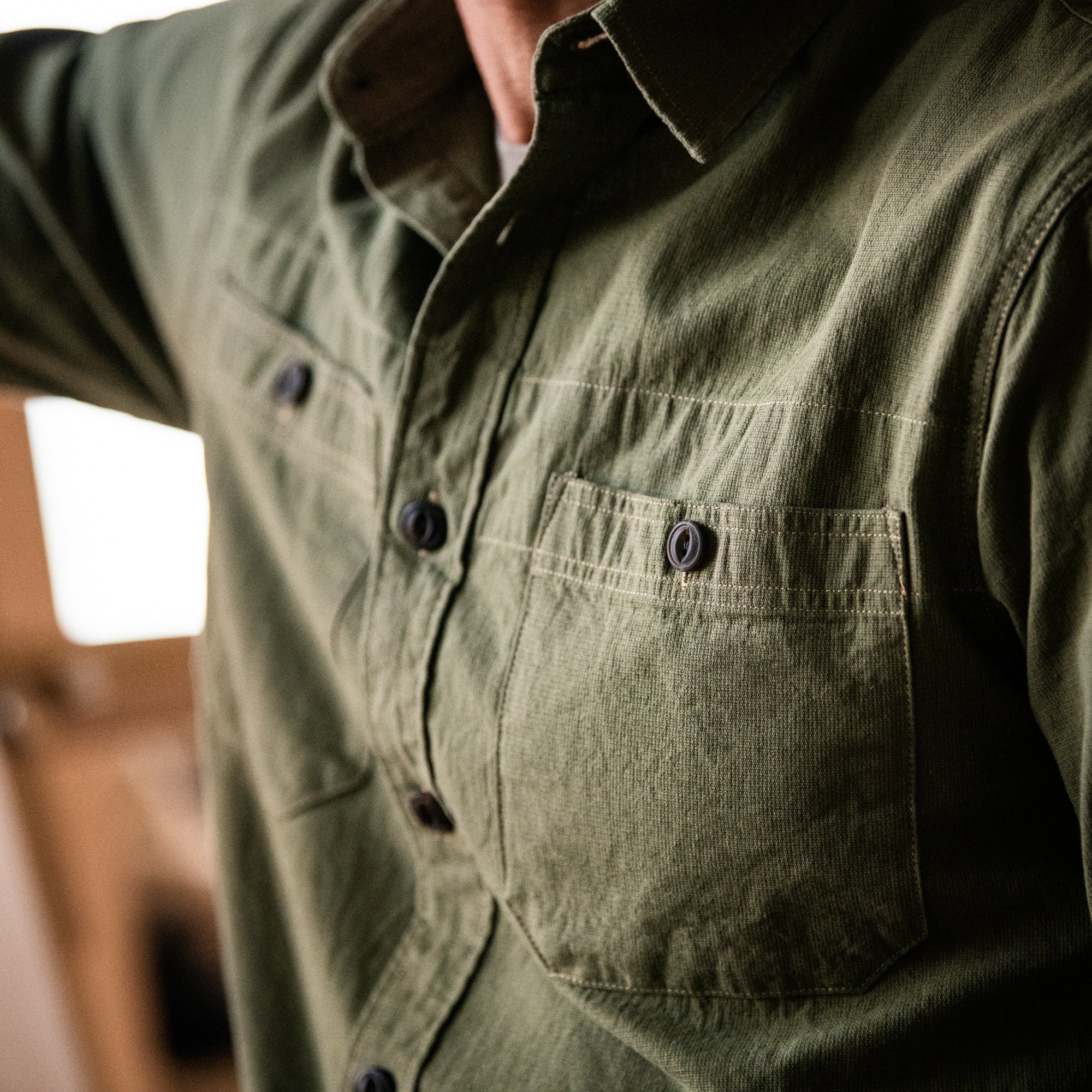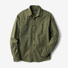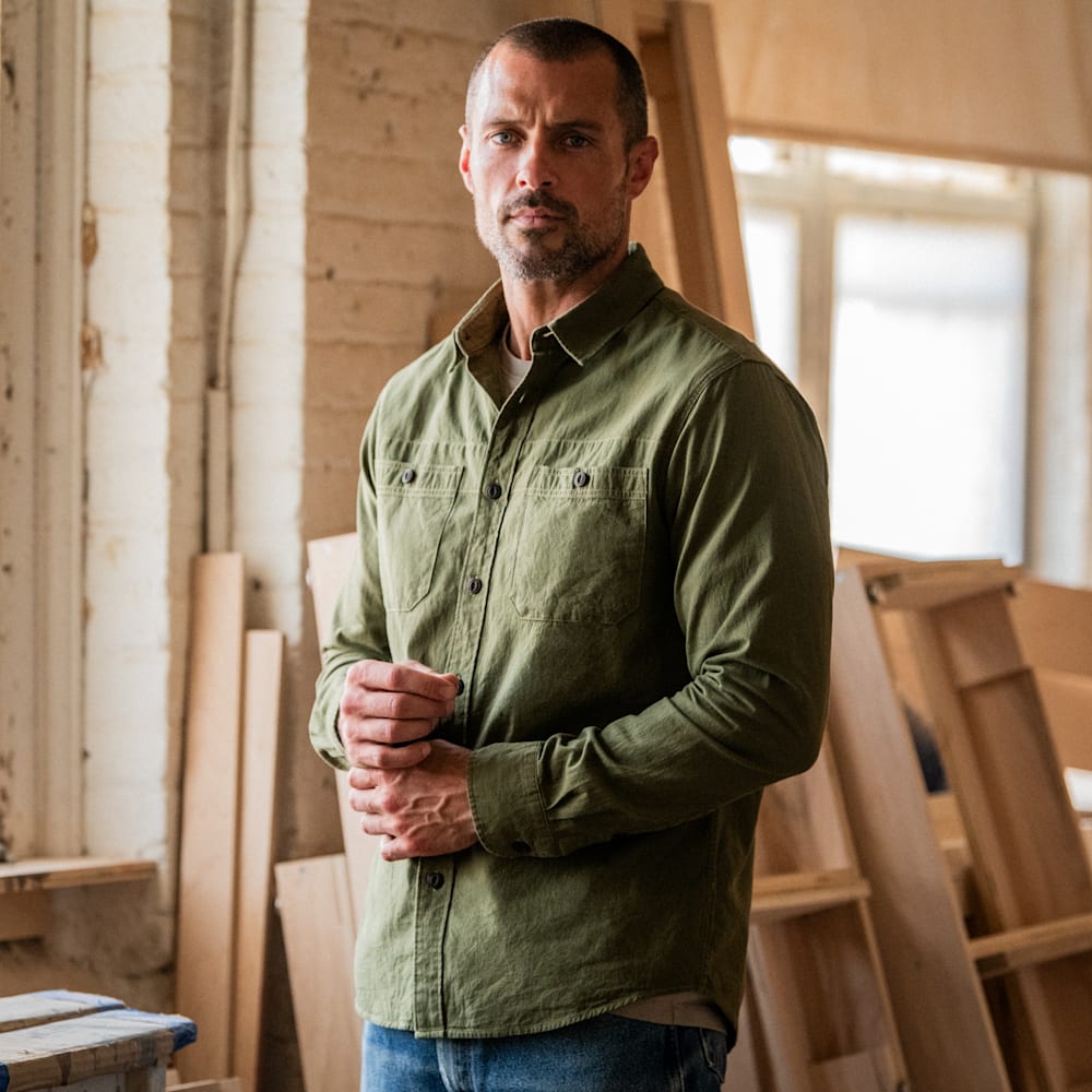 • A traditional utility button-up shirt made from durable shuttle cloth that has a rugged top weave