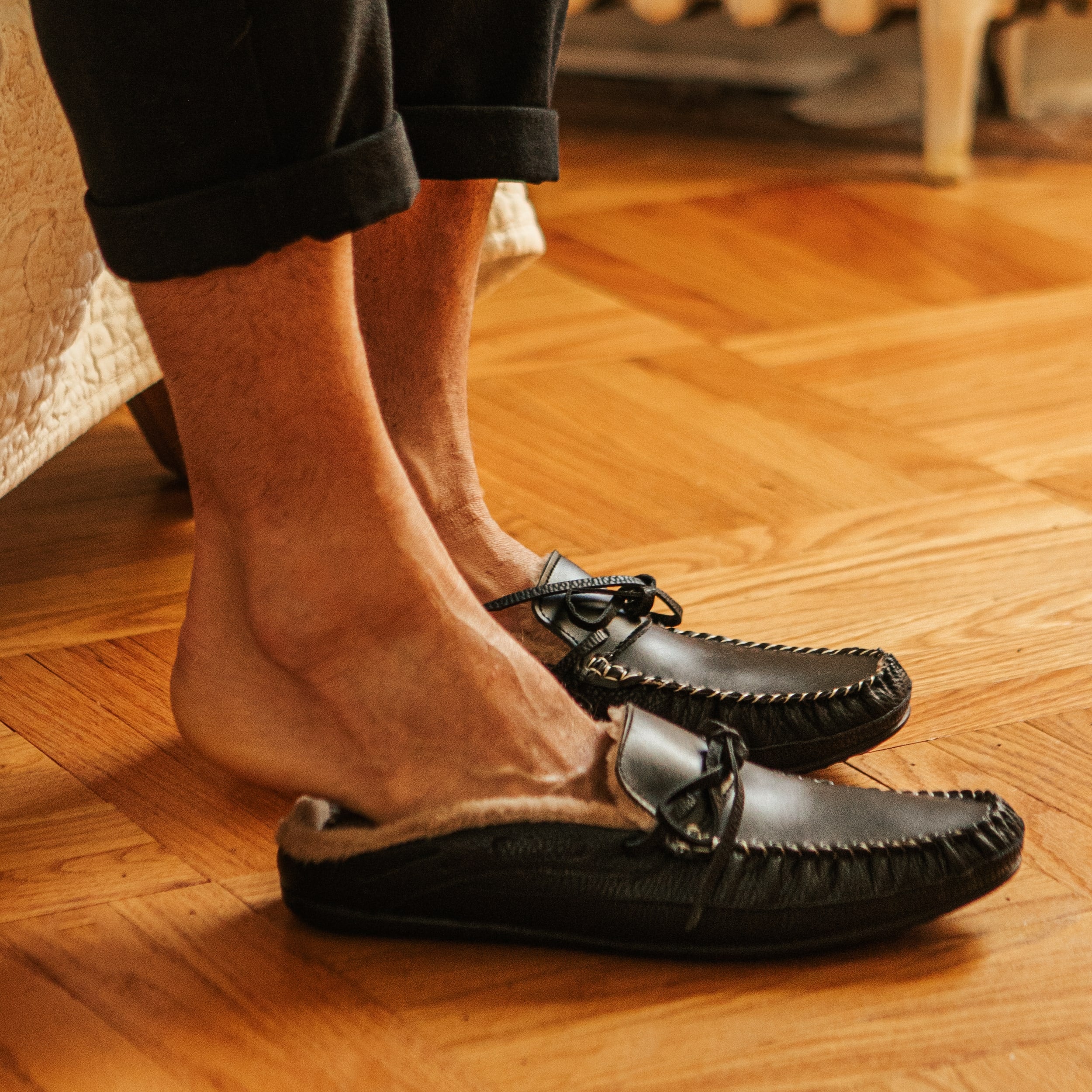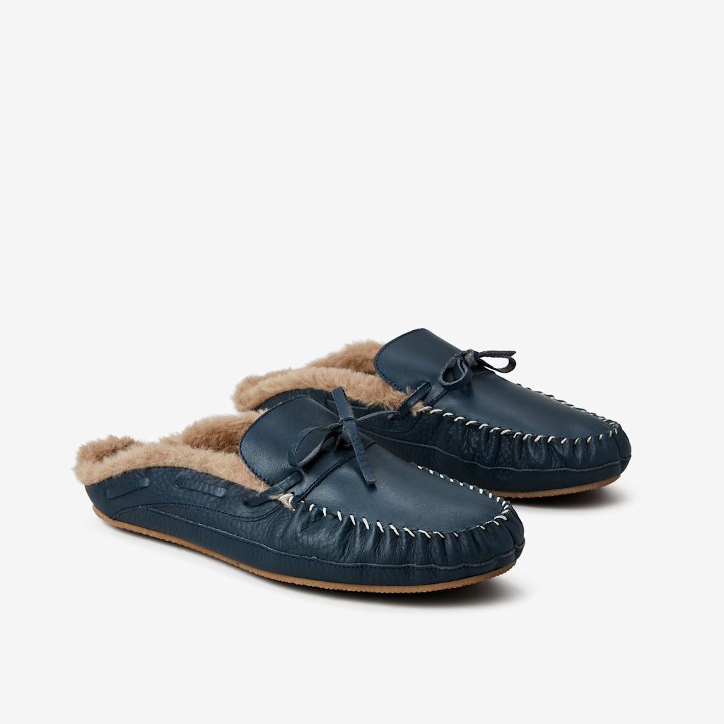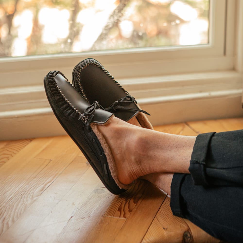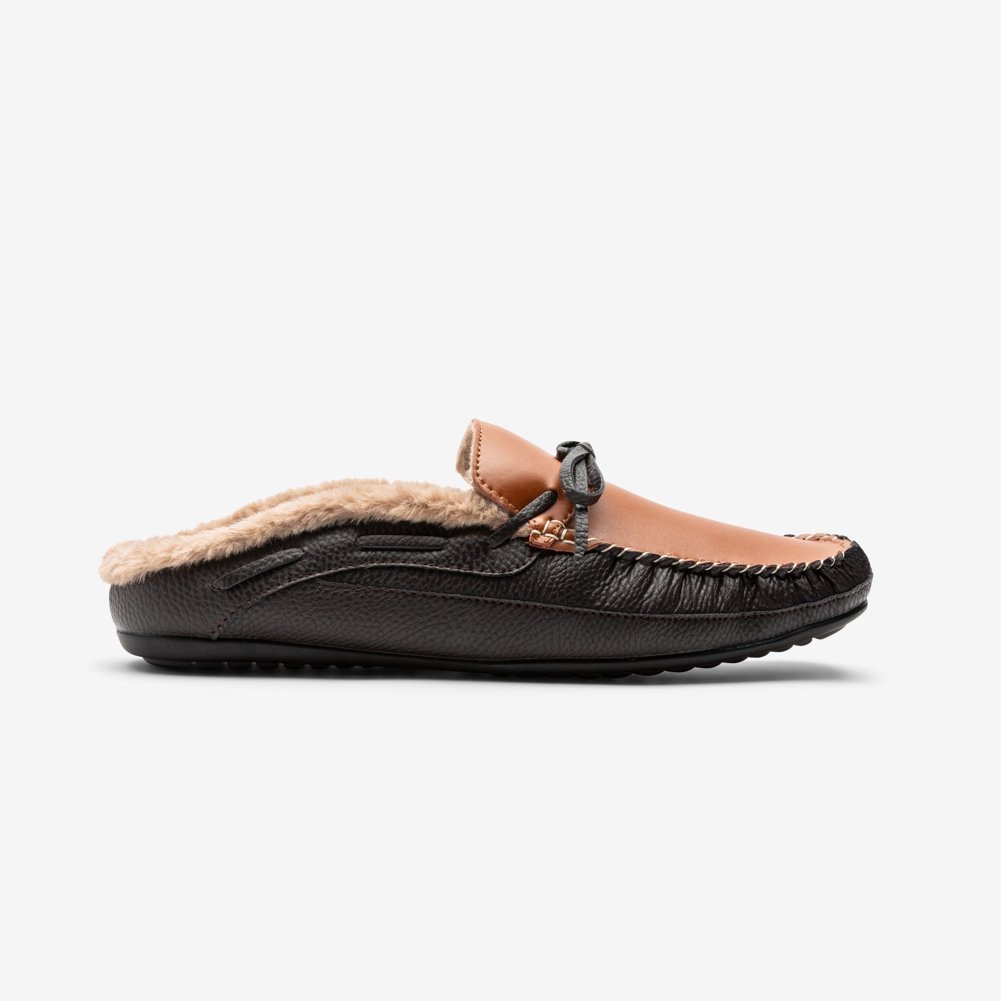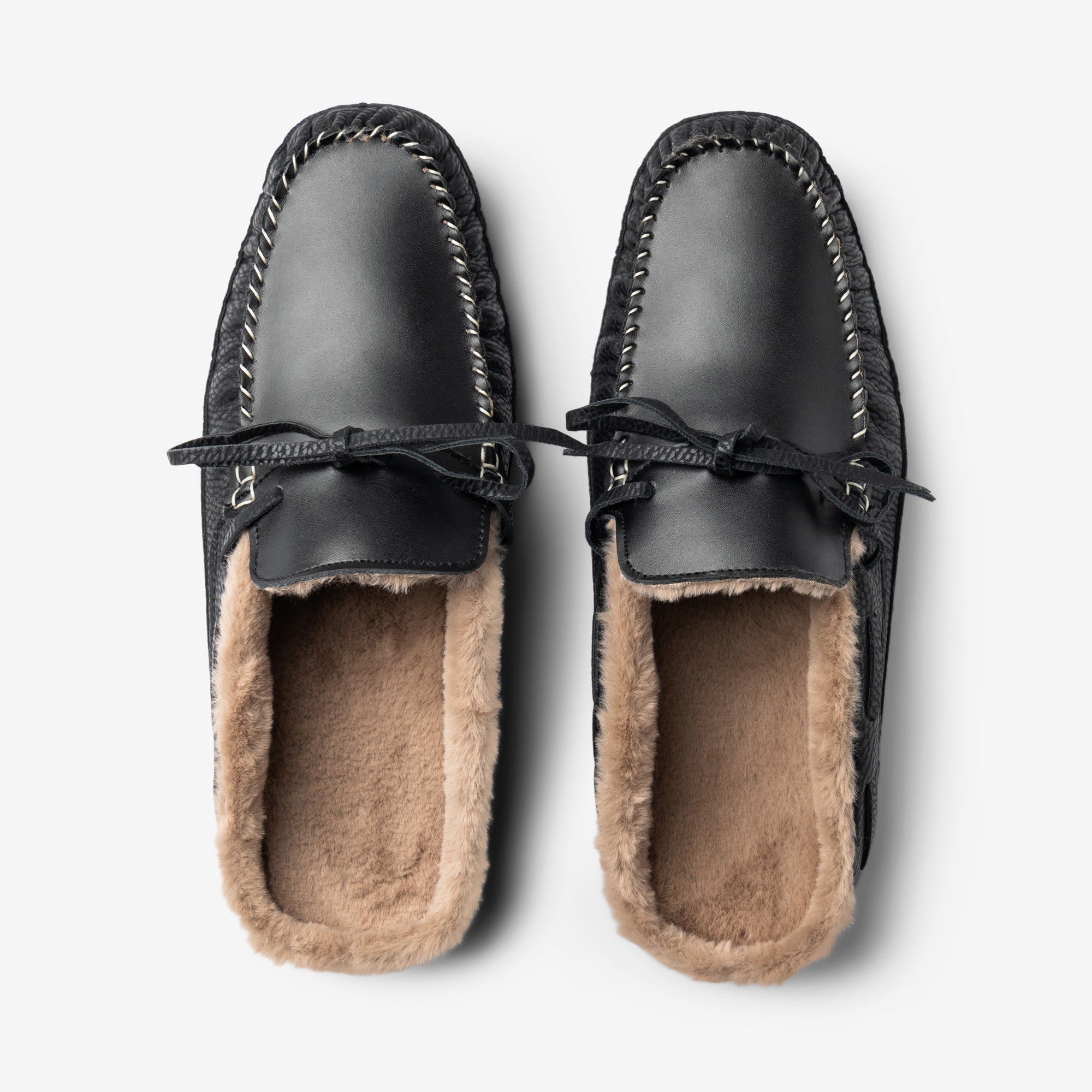 Slippers that help you look good while doing nothing. Slide your feet in through the open back, and let the plush faux fur lining keep them toasty as a cabin hearth. Crafted from leather with a rugged moccasin stitched toes and a grip textured sole, they are so comfortable you may never want to take them off.