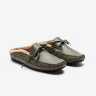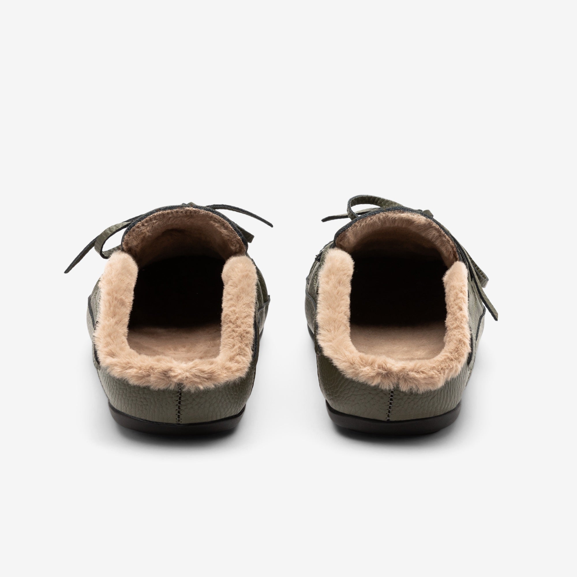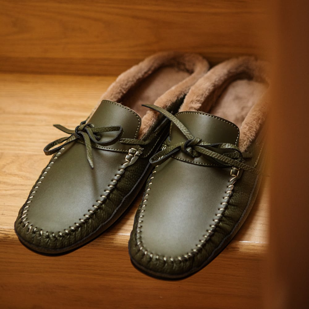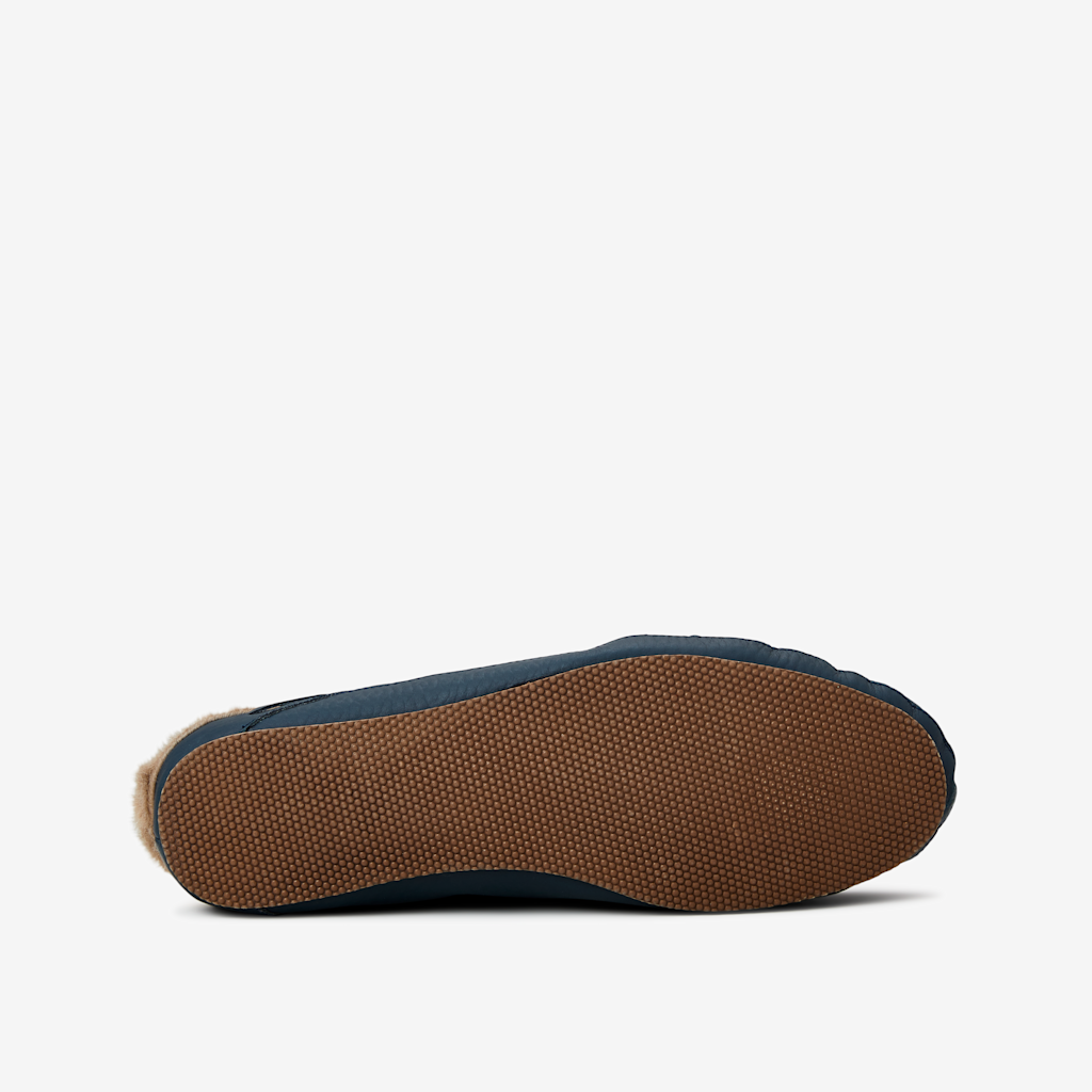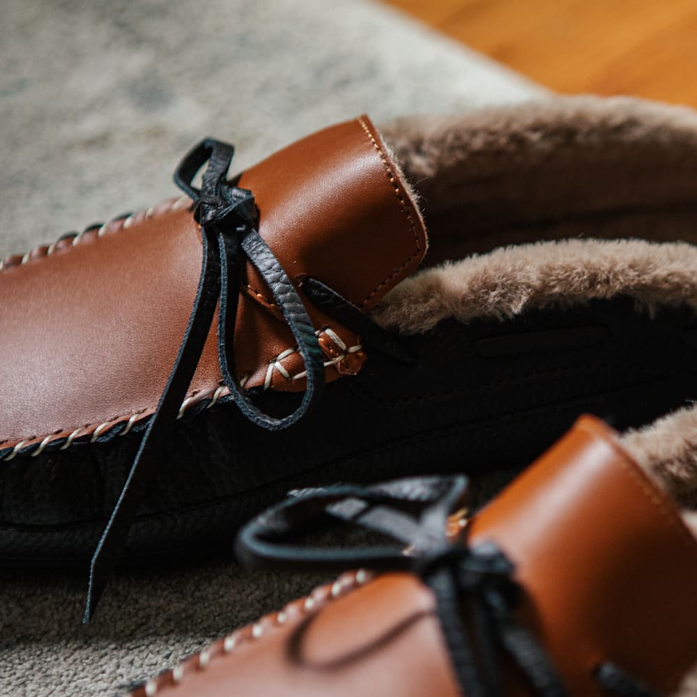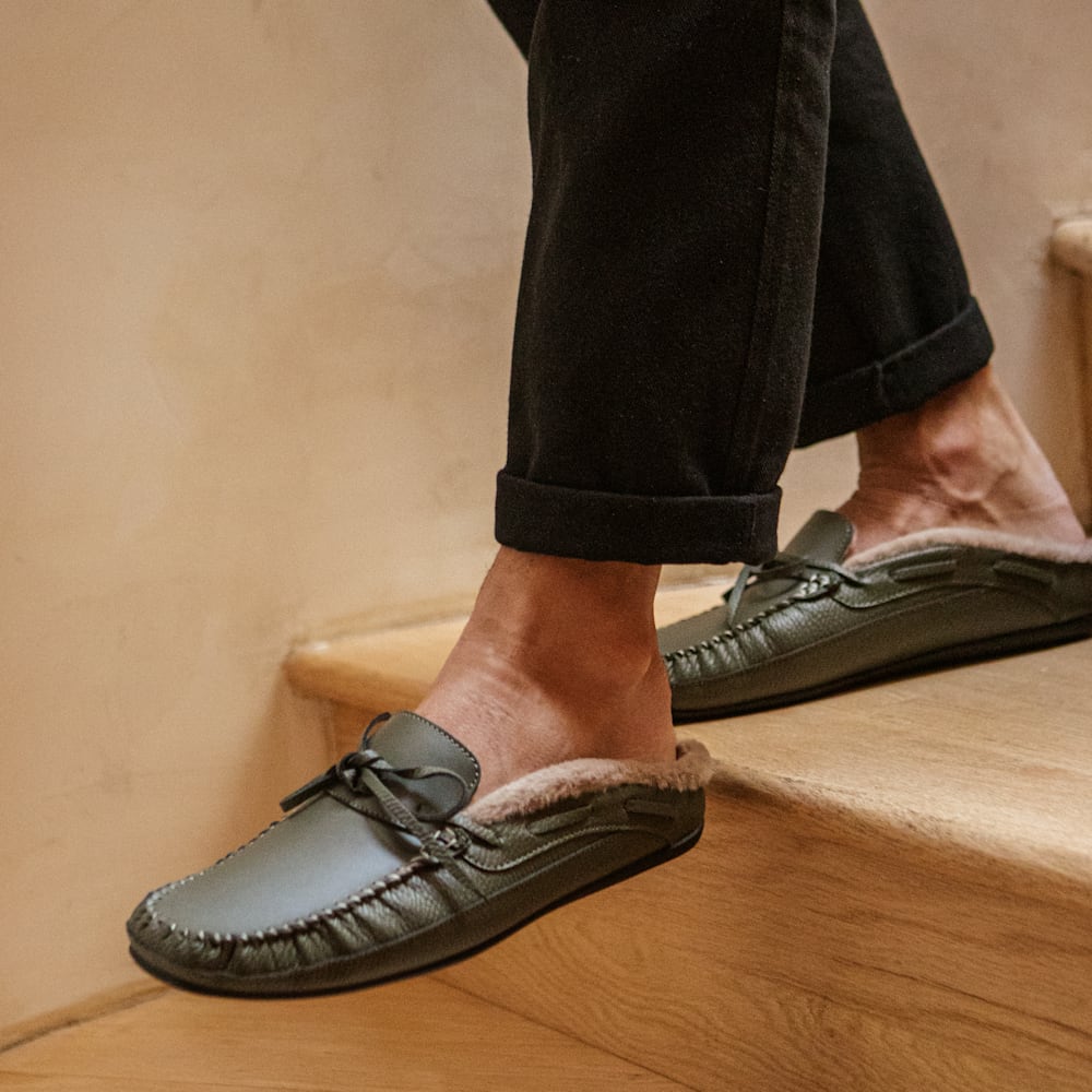Slippers that help you look good while doing nothing. Slide your feet in through the open back, and let the plush faux fur lining keep them toasty as a cabin hearth. Crafted from leather with a rugged moccasin stitched toes and a grip textured sole, they are so comfortable you may never want to take them off.