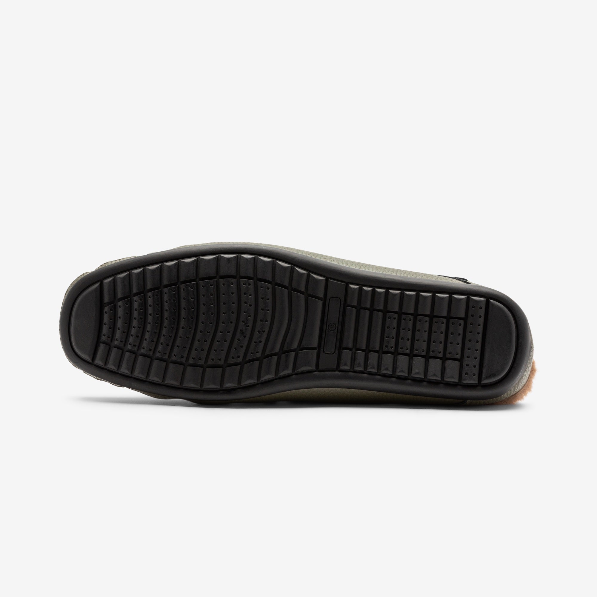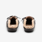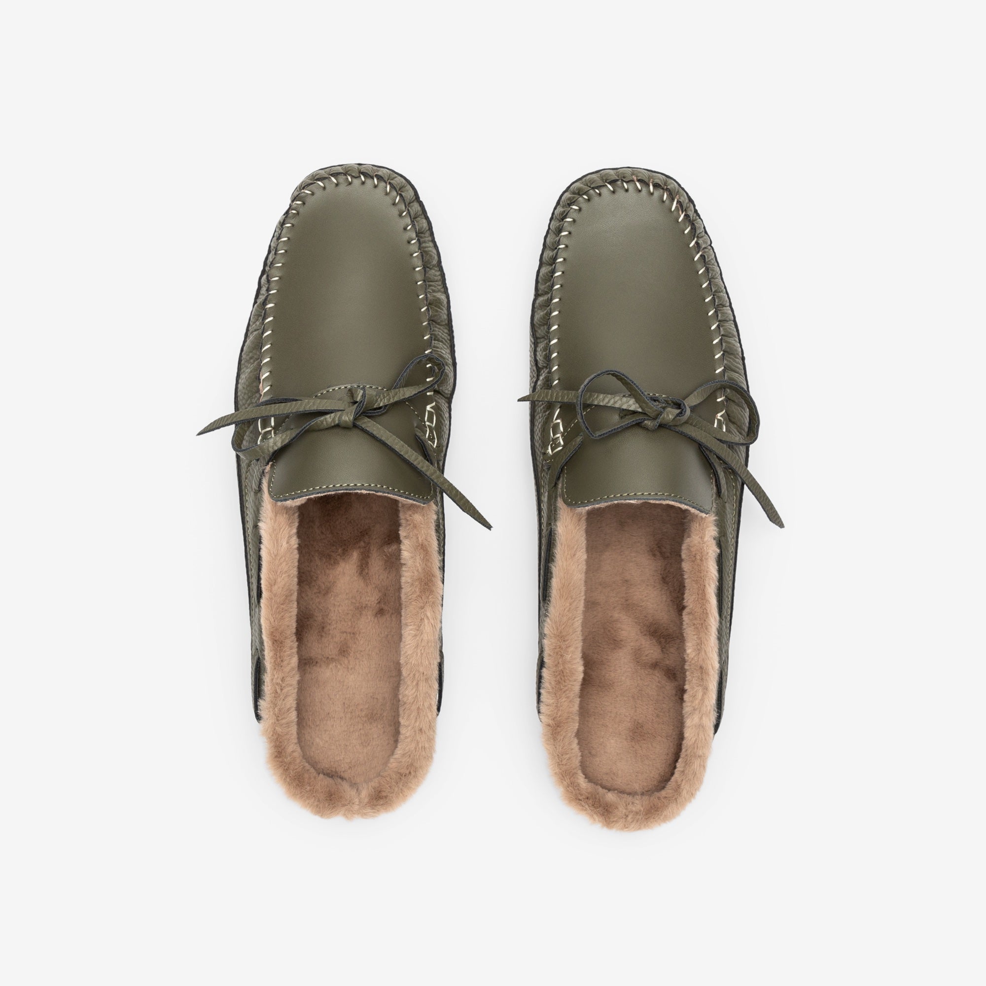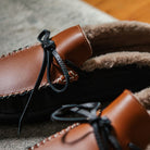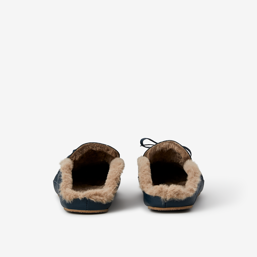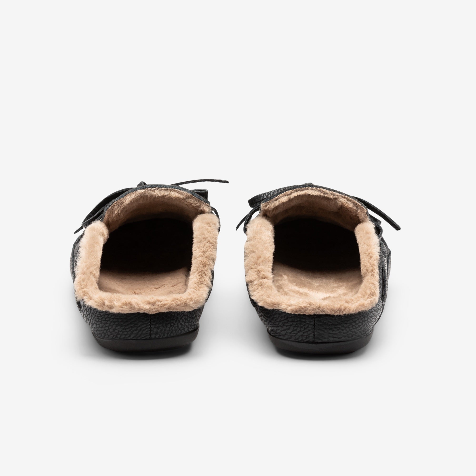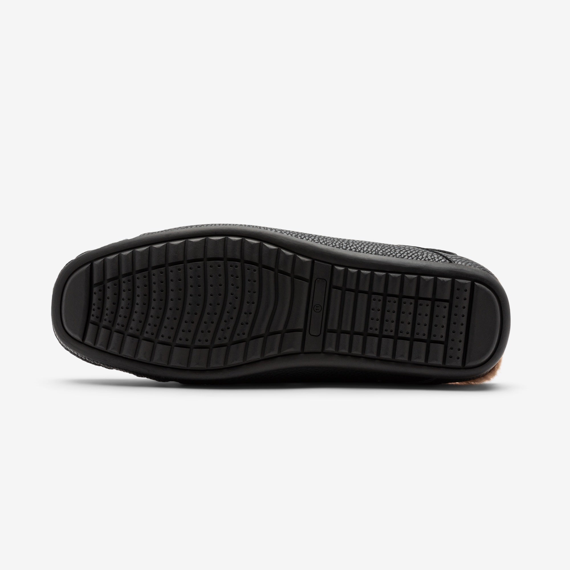 Slippers that help you look good while doing nothing. Slide your feet in through the open back, and let the plush faux fur lining keep them toasty as a cabin hearth. Crafted from leather with a rugged moccasin stitched toes and a grip textured sole, they are so comfortable you may never want to take them off.